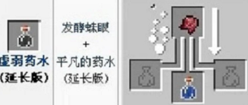 2、基础药水酿造:将装满水的水瓶放入酿造台底部三格,顶部材料槽放入发酵蛛眼,经过3秒酿造过程即可获得基础虚弱药水。这种药水可直接投掷但作用范围有限。