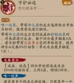 三技能「伞盾庇护」作为核心辅助技,可为指定队友施加持续三回合的不可驱散护盾,同步提升自身与目标30%行动条。护盾存在期间提供60%间接伤害减免效果,且通过神乐的伤害输出可动态补充护盾值。式神自身回合结束后自动获得护盾的特性,大幅增强了全队的生存续航能力。
