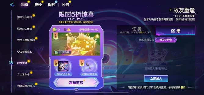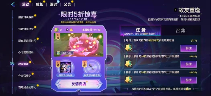 本次同步开启友情商店五折特惠活动,玩家通过完成指定任务获得的友情币可兑换限定商品。