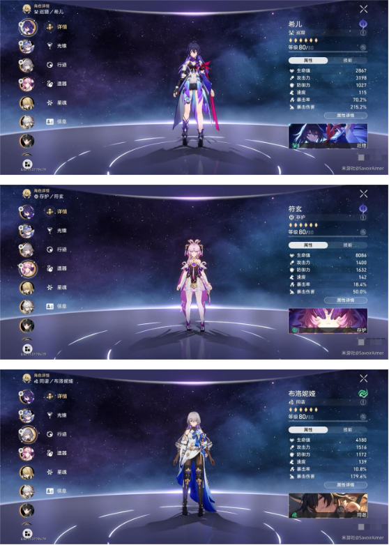 前场组合:希儿(2命+专武)搭配符玄(1命+专武),配合鸭鸭(2命)与佩拉(满命)形成速攻体系。该配置通过符玄的生存保障与佩拉的减防效果,为希儿创造爆发输出环境。