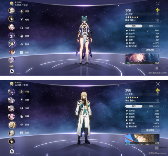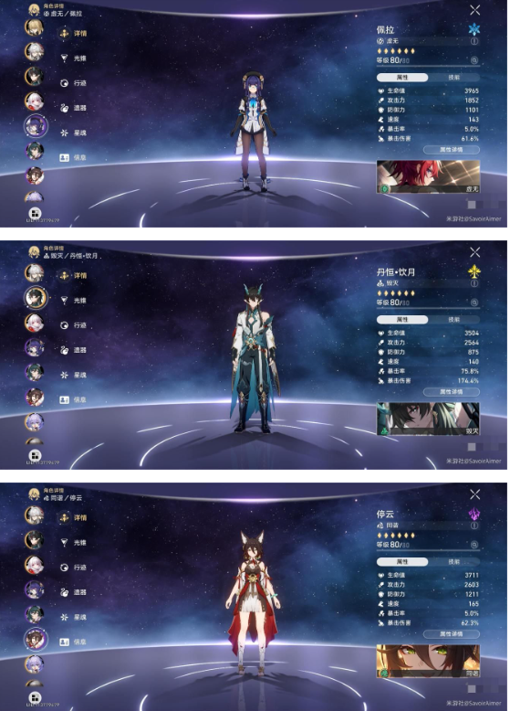 后场配置:饮月君(2命+双专武)联合罗刹(基础配置),辅以停云(4命)与驭空(满命)。该组合利用停云的能量恢复与驭空的增益叠加,持续强化饮月君的核心输出能力。